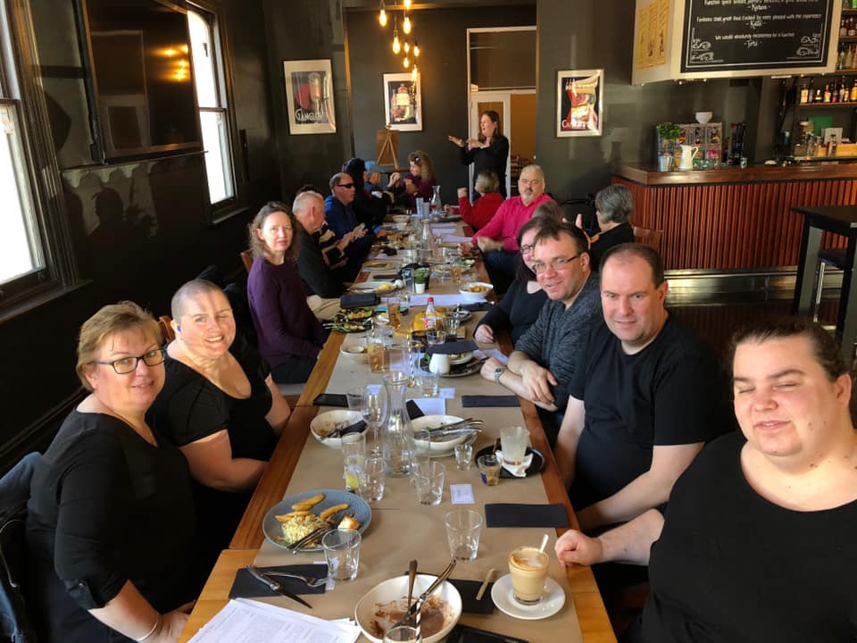 The image on this page is a black and white photo of a group of local Deafblind members, friends and interpreters sitting along a restaurant table. Many are smiling at the camera, with some in the background using Auslan and tactile Auslan.